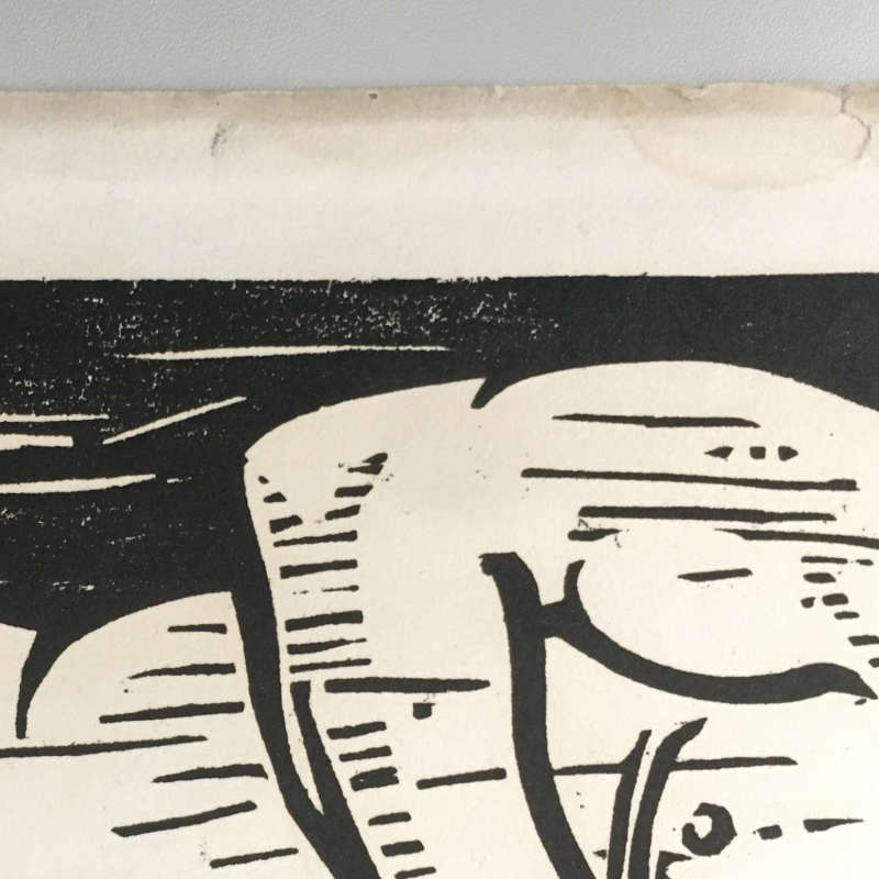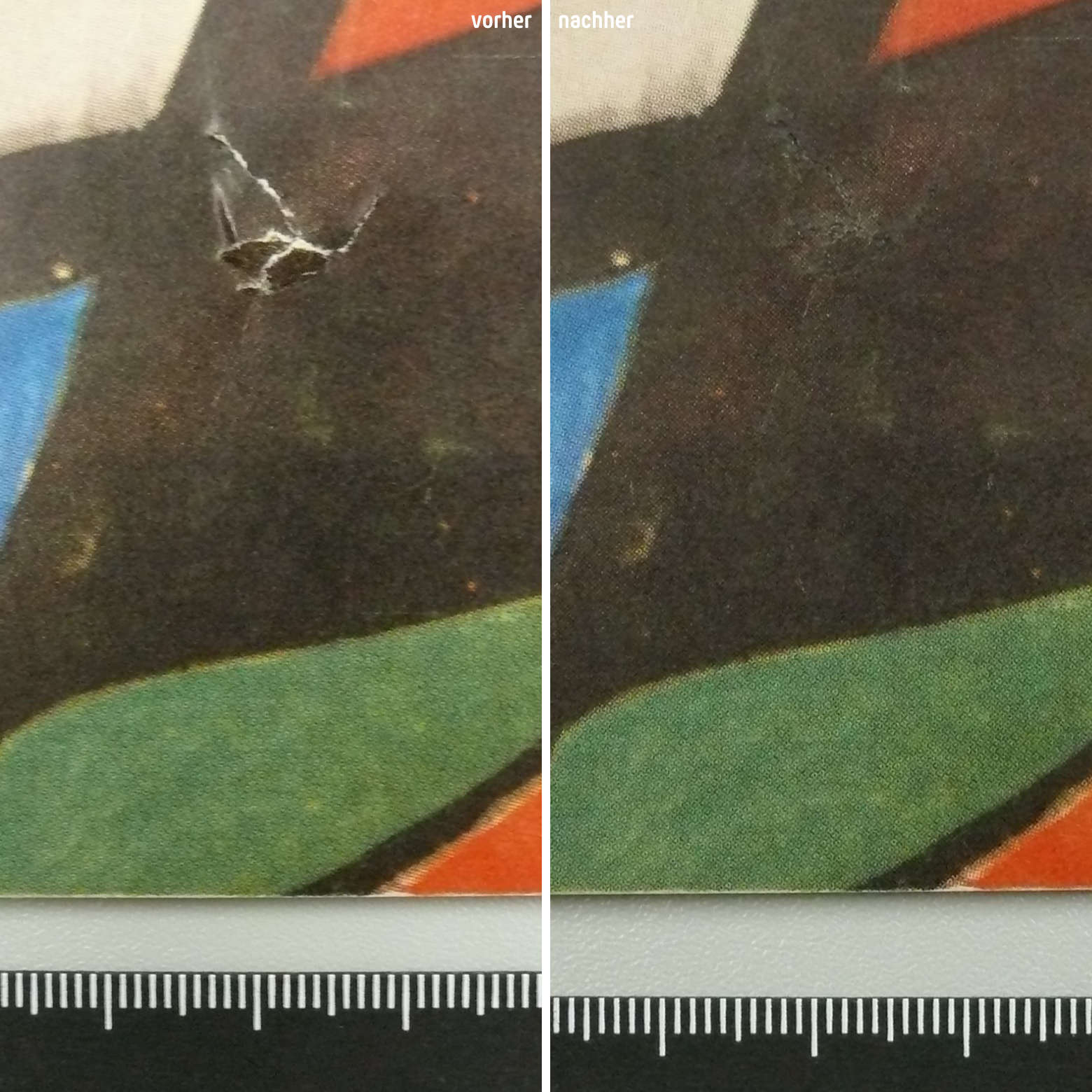 schließen, ergänzen, glättenIn diesem Fall konnte der deformierte Bereich durch leichtes partielles Feuchten und anschließendes Glätten unter Gewicht beruhigt werden. Risskanten wurden richtig gelegt und rückseitig leicht verklebt. Danach konnte eine punktuelle Retusche mit Aquarellfarbe den Bereich weiter beruhigen.