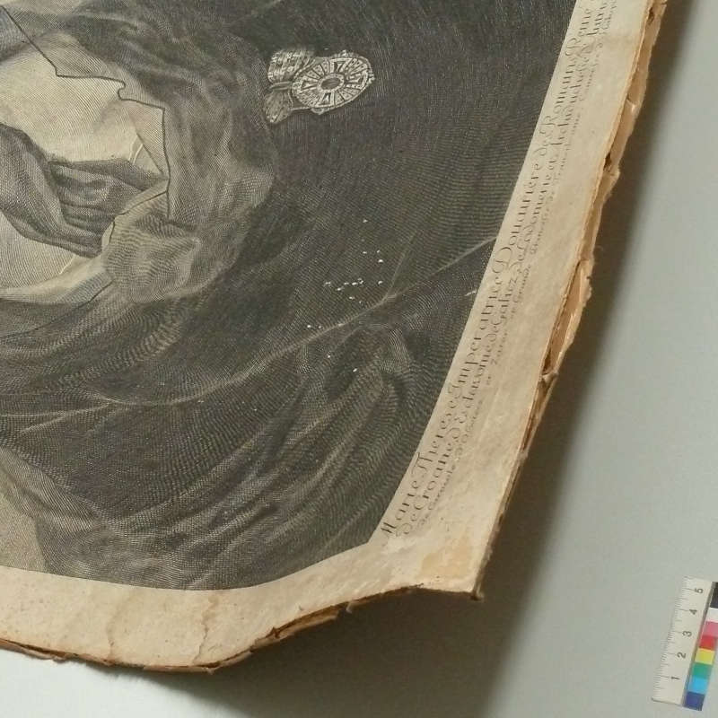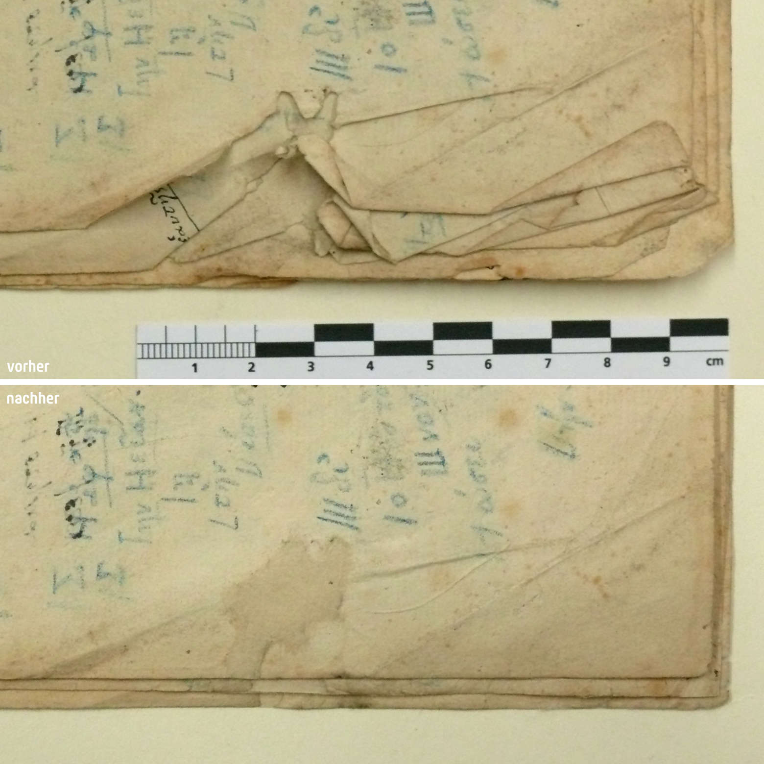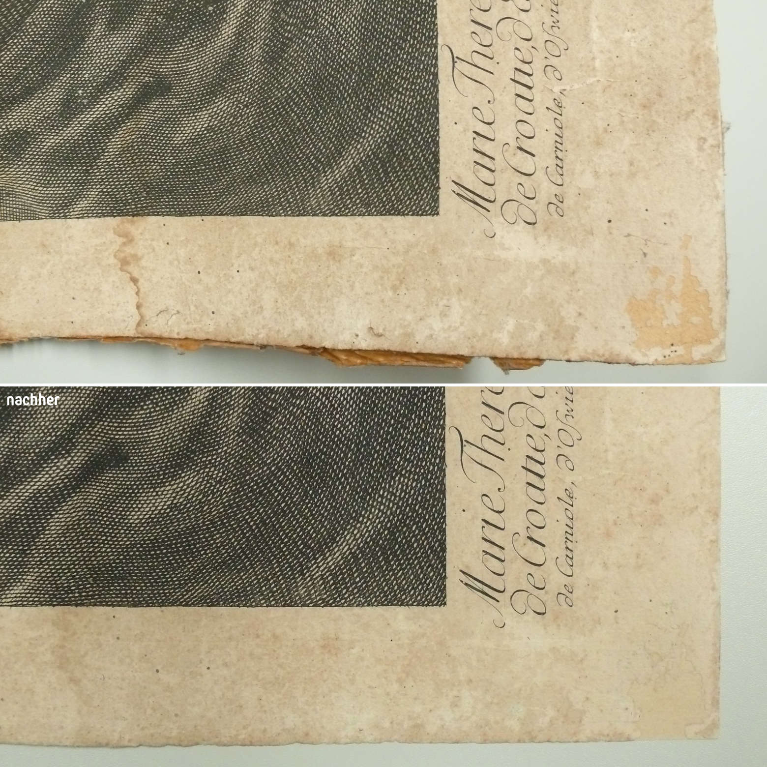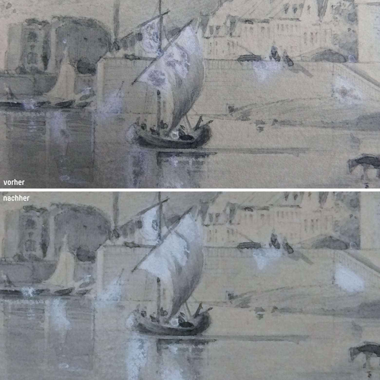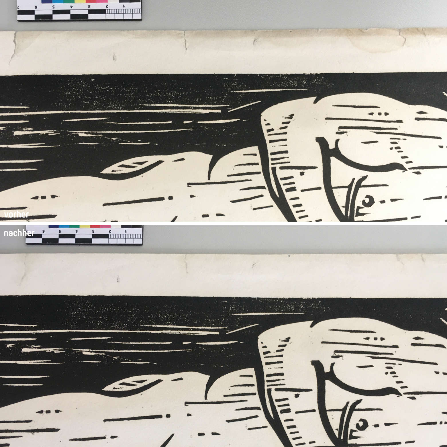 schließen, retuschieren, glättenObjekte können durch alte Montierungen und schlechte Lagerungsbedingungen stark geschädigt sein. Aber auch bei solch schweren Schadensbildern kann abhängig von der Empfindlichkeit der Mal- bzw. Druckfarben, der Papierbeschaffenheit und aller anderen verwendeten Materialien durchaus eine erhebliche Verbesserung des Objektzustands erreicht werden.