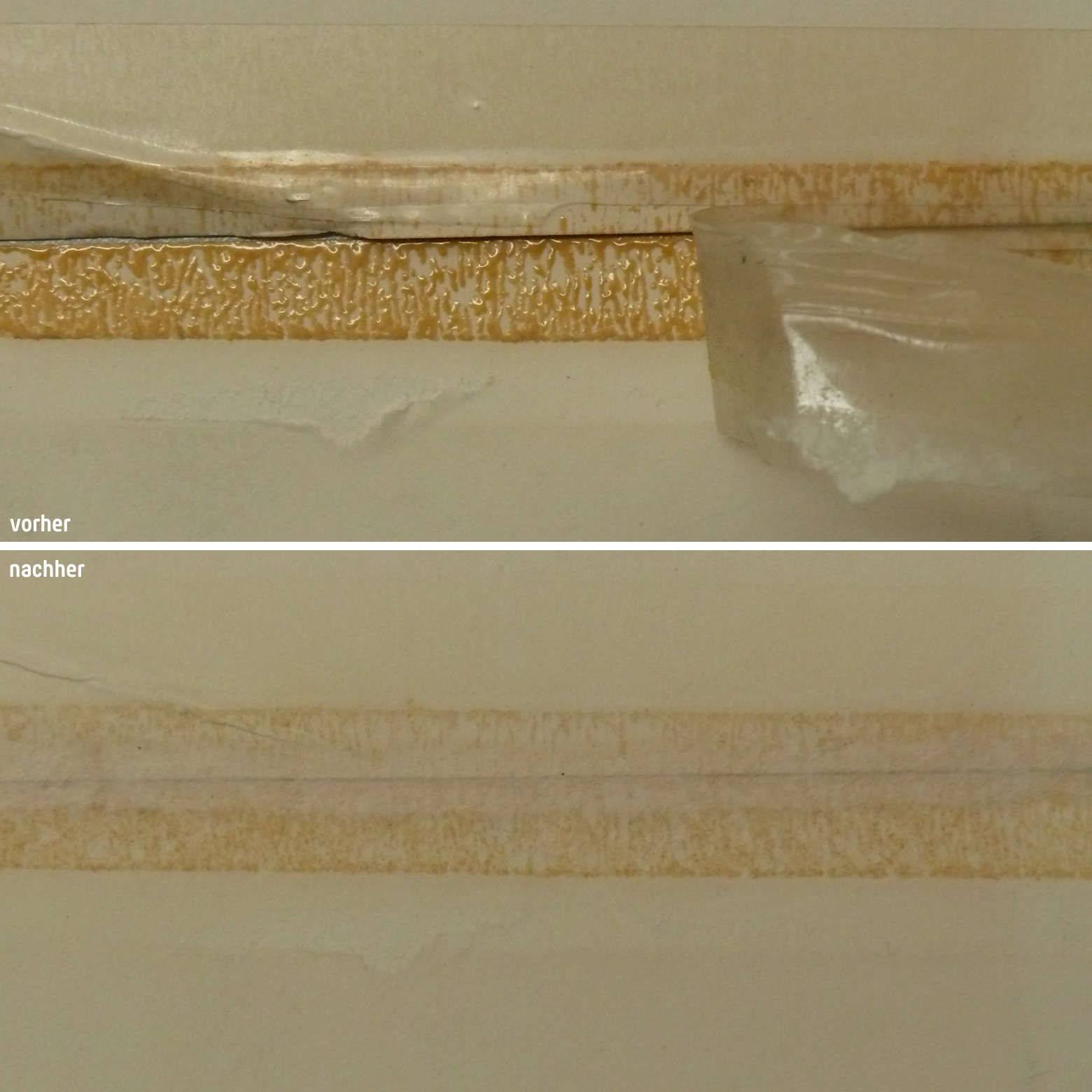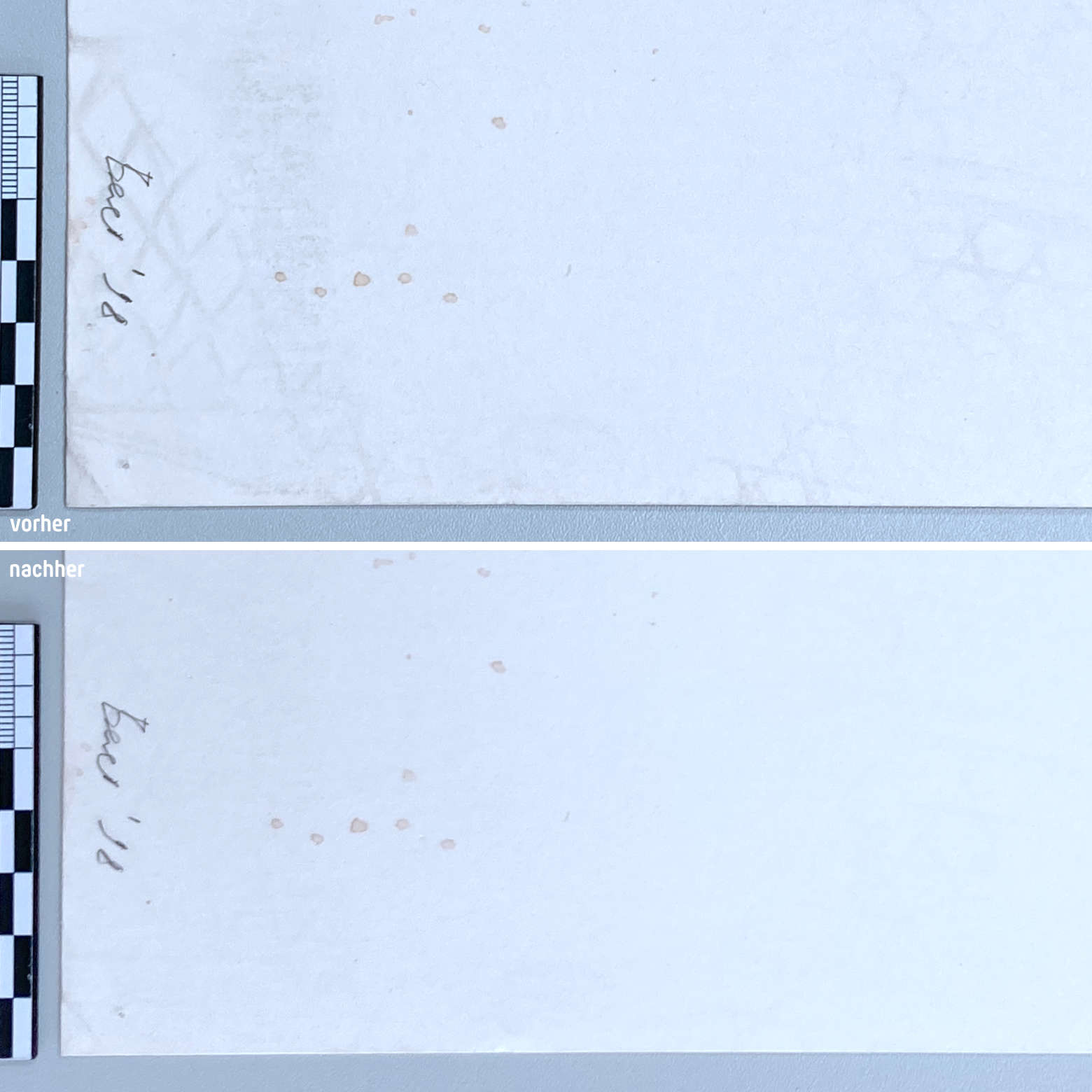 Mögliche Reinigungsmethoden: Trockenreinigung mit speziellen Radiermitteln, mechanisches Entfernen/Reduzieren von fester oder tiefer sitzenden Schmutzpartikeln