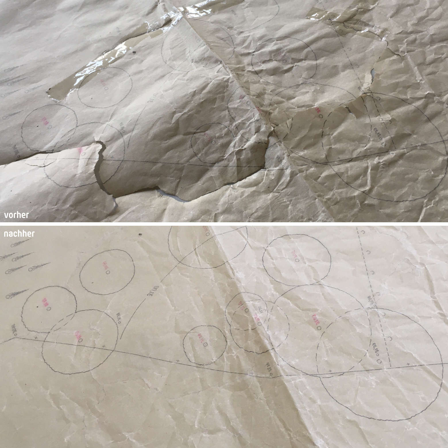 ablösen, reduzieren, extrahierenTrockenreinigung, mechanisches Abnehmen von Klebebandträgern und Klebstoffresten, passgenaues Schließen von Rissen mit wärmeaktivierbarem, klebstoffbeschichtetem Japanpapier, Ergänzen von Fehlstellen, ganzflächiges Glätten von Großformaten, archivgerechte Verpackung/Aufbewahrung.